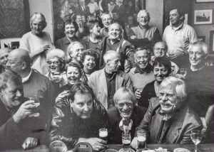 ‘De mensen van Jan’ is een uniek boek, niet alleen vanwege de fraaie foto’s – anders dan in de krant nu gedrukt op glanzend papier – maar ook om de tekst bij de afbeeldingen, meer dan een loutere toelichting. Geert Willems sprak met Jan’s tijdgenoten om het een en ander te weten te komen over de achtergrond, de verhalen achter de foto’s. De afbeeldingen en verhalen vormen een kroniek van Nijmegen in de jaren 1960 tot 2000, een tijdsbeeld, dat ongetwijfeld herinneringen oproept voorbije gebeurtenissen. Onder ‘De mensen van Jan’ bevonden zich ook kunstenaars en journalisten, die Jan van Teeffelen vaak trof in de City Bar, het befaamde café van uitbater Jo Samson, onderaan de Houtstraat. Het wekt geen verbazing, dat het in 1977 onthulde kroegschilderij van Rob Terwindt twee keer voorkomt in ‘De mensen van Jan’. De foto’s zijn gemaakt tijdens een (of twee?) vijfjaarlijkse reünies van de stamgasten. Zij poseerden dan voor het schilderij, waar mogelijk volgens de plaats op het kroegtafereel. Zo niet Jan van Teeffelen, die lachend tussen de journalisten Wil Kester en Harrie Janssen zit.