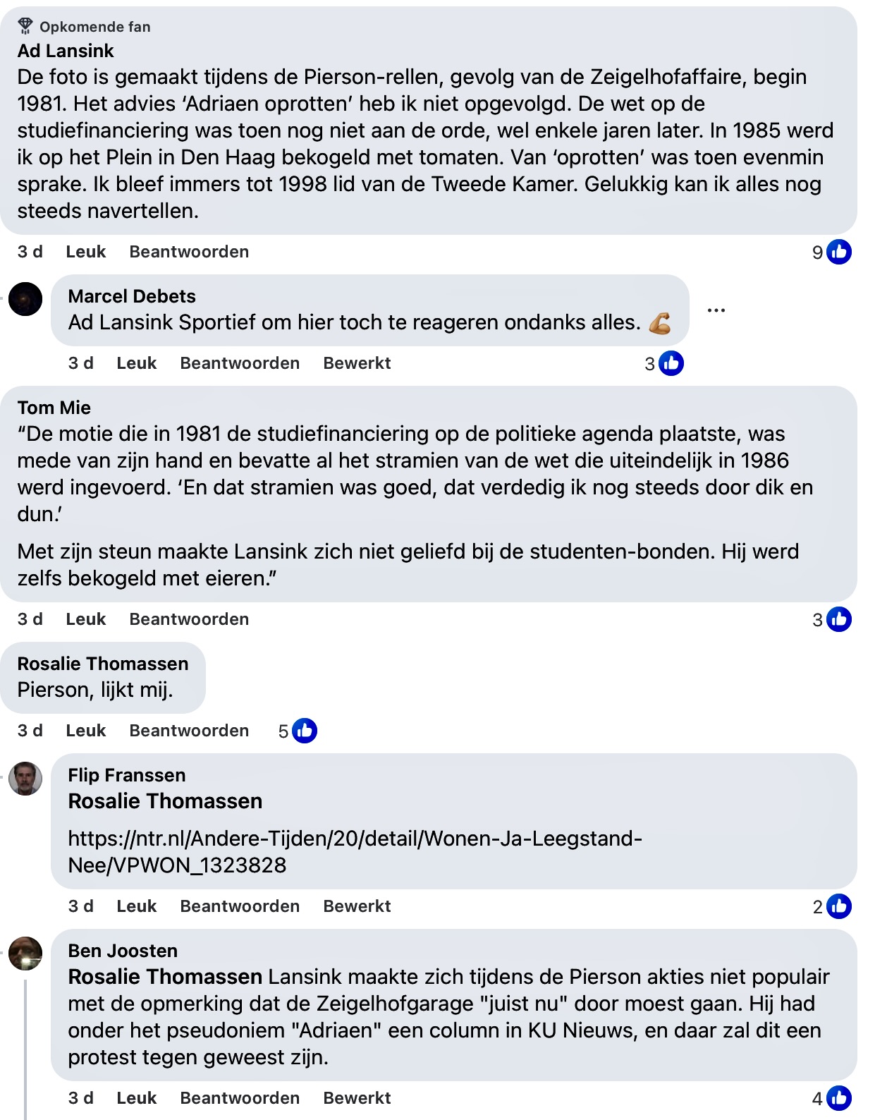 Het leek mij nuttig om de eventuele lezers van de Facebook-pagina van de Stichting Jan van Teeffelen te bevestigen, dat de foto te maken had met de Piersonrellen, een gevolg van het domstreden besluit om op de Zeigelhof een parkeergarage te bouwen, destijds een politiek compromis van PvdA en CDA. Zelf gaf ik overigens de voorkeur aan een parkeergarage onder Plein 1944. Maar dat terzijde: de verdediging van het compromis werd mij niet in dank afgenomen. Maar dat terzijde. Ben Joosten legt terecht het verband met het KU-Nieuws, de kranten in de wikkels met oproep ‘Lansink oprotten’. In 1980 en 1981 schreef ik onder de naam Adriaen op verzoek van Bert Heffels regelmatig columns in het KU-Nieuws. Toen Paul Scheffer in Vrij Nederland mijn identiteit had onthuld, was de slogan ‘Adriaen oprotten’ snel geboren, o.m. paginagroot op een van de studentenflats bij mij in de buurt. Het schelden deed destijds geen pijn, wel de bittere noodzaak van een wekenlange politiebewaking.