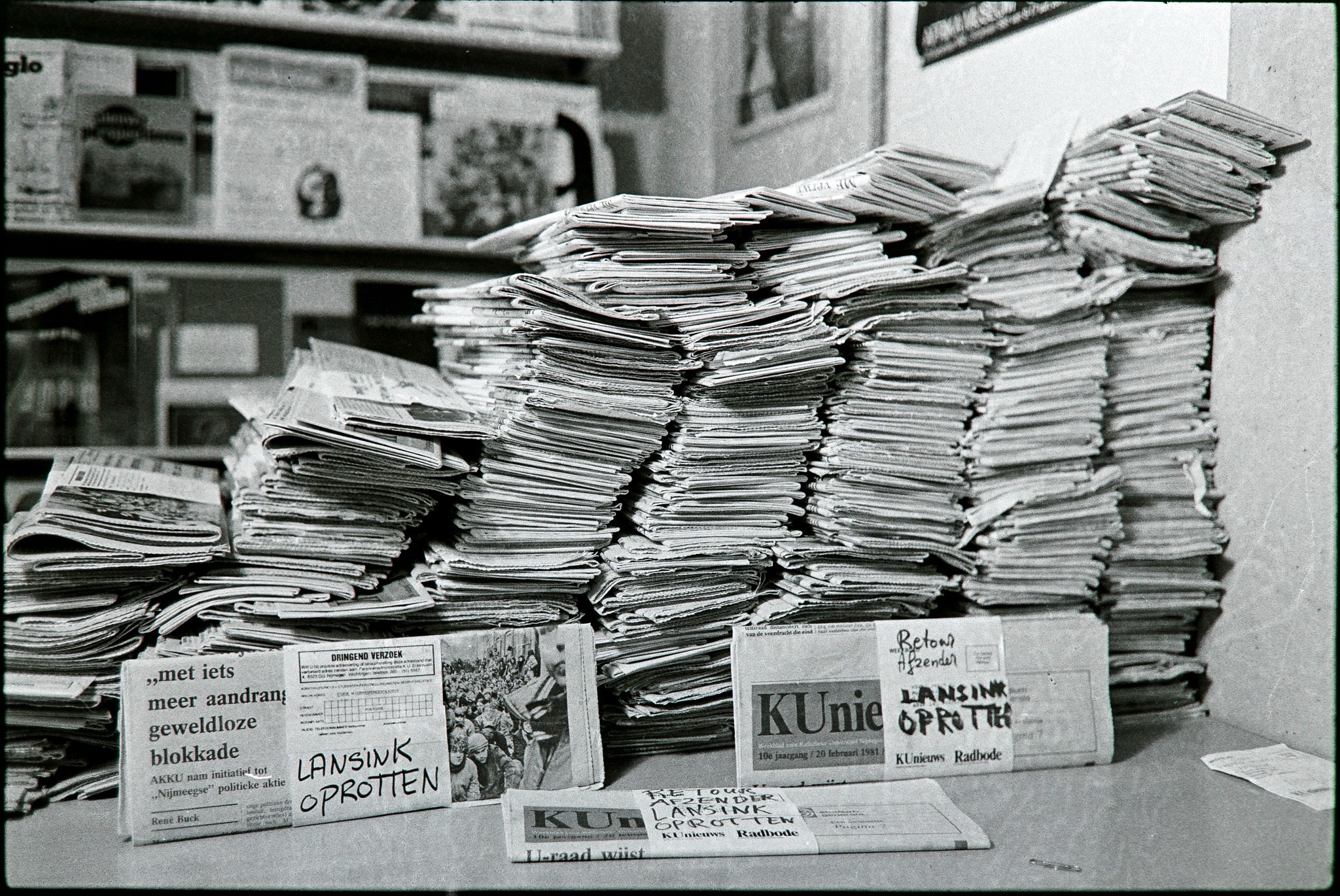 Overigens publiceert de Stichting Jan van Teeffelen nog steeds foto’s uit het rijke archief van de befaamde Nijmeegse stadsfotograaf, weliswaar niet meer met de regelmaat van de klok maar toch vaak genoeg om de bewondering voor de kleine man met de grote Leica vast te houden. Onlangs verscheen op de Facebook-pagina van de Stichting Jan van Teeffelen een afbeelding, die mij deed terugdenken aan het roerige jaar 1981. De z.g. Piersonrellen, ook wel aangeduid als de Zeigelhoffaffaire haalden het landelijke nieuws. Zonder aanduiding van jaartal en locatie roept de foto kennelijk de vraag op, waarom Ad Lansink moet oprotten. Jan van Teeffelen heeft slechts een forse stapel kranten in beeld gebracht. Jochem van der Kwast, redacteur van de Stichting Jan van Teeffelen schrijft bij de foto: Wat er gebeurd is, om zo tekeer te gaan, weet ik niet, maar het is een mooie foto. De reacties waren niet eenduidig. Rosalie Thomassen noemt Pierson, maar Tom Mie verbindt de oproep op de krantenwinkels aan de (protesten tegen) studiefinanciering.
