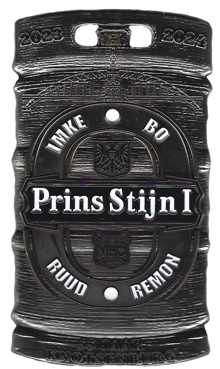 Het is gebruikelijk, dat de nieuwe Prins van Knotsenburg zijn voorgangers onderscheidt met zijn Prinsenorde. De ex-prinsen beschikken afhankelijk van het jaar van hun uitverkiezing een grote of kleine(re) verzameling van Prinsenonderscheidingen, de een nog mooier dan de andere. Aanvankelijk kregen de leden van het Prinsenconvent de nieuwe ‘Prinsenplak’ tijdens de receptie van de nieuwe Prins. De steeds langere rij van exen noopte tot een minder tijdrovende uitreiking. De eerste Prinsenborrel na de Prinsenproclamatie bleek een mooi alternatief. Nieuwsgierig naar wat Prins Stijn I te melden en te geven had trok een buitensporig groot aantal exen enkele dagen na de unieke Prinsenproclamatie naar Feestcafé De Gezelligheid in de Bloemerstraat, waar het Kabinet van Prins Stijn I naar binnen werd gezongen door het inmiddels befaamde Conventskoor. De uit de Hofraad afkomstige Prins onderstreepte zijn waardering voor de opzet en uitvoering van ’The First Night of the Prince’ om vervolgens alle exen protocollair te onderscheiden. Dat de ene na de andere ex-prins schrok van het gewicht van zijn bijzondere Prinsenorde, ontging Stijn I waarschijnlijk. Zijn ‘Prinsenplak’ is bijzonder, niet alleen vanwege het gewicht, maar ook om vorm, uitvoering en vermelding van de namen van alle Kabinetsleden. De vorm van het indrukwekkende biervat heeft ongetwijfeld te maken met de dagelijkse besognes van de prins. Het forse gewicht heeft als voordeel, dat de gelauwerde Knotsenburger voelt wat in handen te hebben. Maar de ‘pan uit swingen’ wordt wel een hele uitdaging. Uniek is de vermelding en rangschikking van de wit gekleurde namen van pages en adjudanten: Mike en Bo boven en Ruud en Remon onder de ook witte Prins Stijn I, die zich wel een grotere letter veroorloofde. Zet Stijn I met zijn Prinsenonderscheiding een nieuwe norm? Wordt het gewicht – nu maar liefst 260 gram – volgende jaren overtroffen? Want terugkeer naar de ronde of ovalen, bescheiden ‘Prinsenplakken’ uit de jaren 1968 tot 1994, die tussen 20 en 40 gram wogen, lijkt uitgesloten. Dick I (1981) en Andre I (1995) weken voor het eerst af van de klassieke vorm, waarna Peter I (1996) met zijn tuba de vrije-vormen-reeks opende: schilderpalet, racevlaggen, vierkanten tussen eertijdse modellen. Niet alle prinsen lieten zich in de kaart kijken, Maar het gewicht nam wel toe, ook afhankelijk van het materiaal. Roy I (2022) scoorde 109 gram, Marck I (2020) zelfs 128 gram. Prins Stijn I vestigt met zijn even fraaie als gewichtige onderscheiding een Prinsenplakken-record. Zou hem dat ooit ontnomen worden? De toekomst zal het leren.