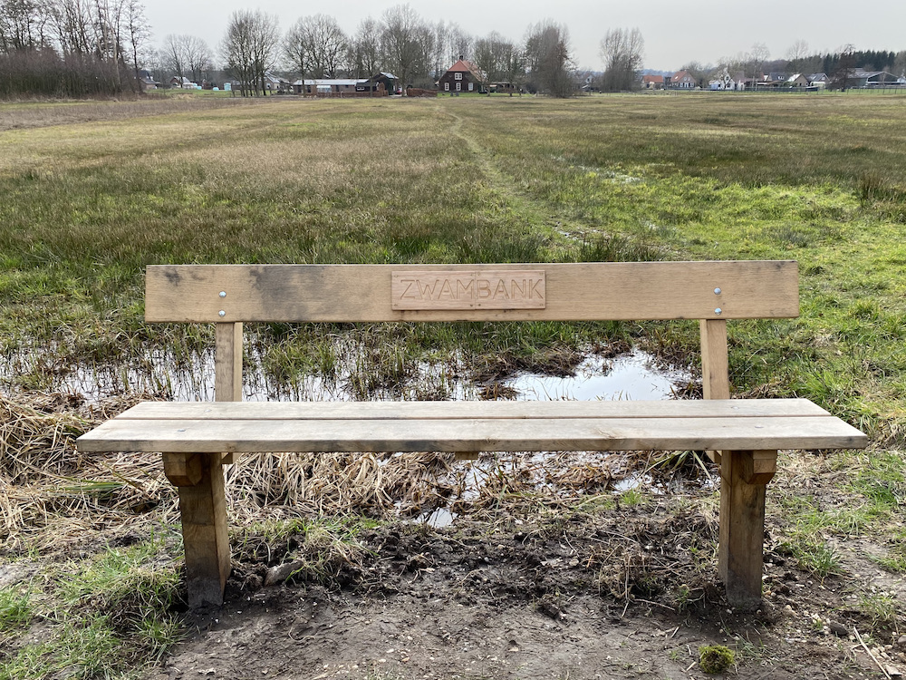 Normaal gesproken staat Zwam voor een bepaald soort paddenstoelen, die in het najaar ook in de Bruuk te vinden zijn, zelfs niet ver van de Zwambank. Maar het ligt meer voor de hand, dat de Zwambank een zachtaardige variant is van de leugenbank: het praatmeubel voor mensen, die in hun vrije tijd met goede bedoelingen een loopje nemen met de waarheid. De omgeving van de Zwambank nodigt trouwens uit voor fantasierijke gedachten over natuur en landschap. Het uitzicht op het bijna kaarsrechte pad door het grote grasland biedt volop ruimte voor allerlei bespiegelingen, of voor serieuze zwampartijen over verleden, heden en toekomst. Het hoofd leegmaken, zogezegd: een zinnige therapie, voor alle mensen, die even willen ontsnappen aan de drukte van alledag.